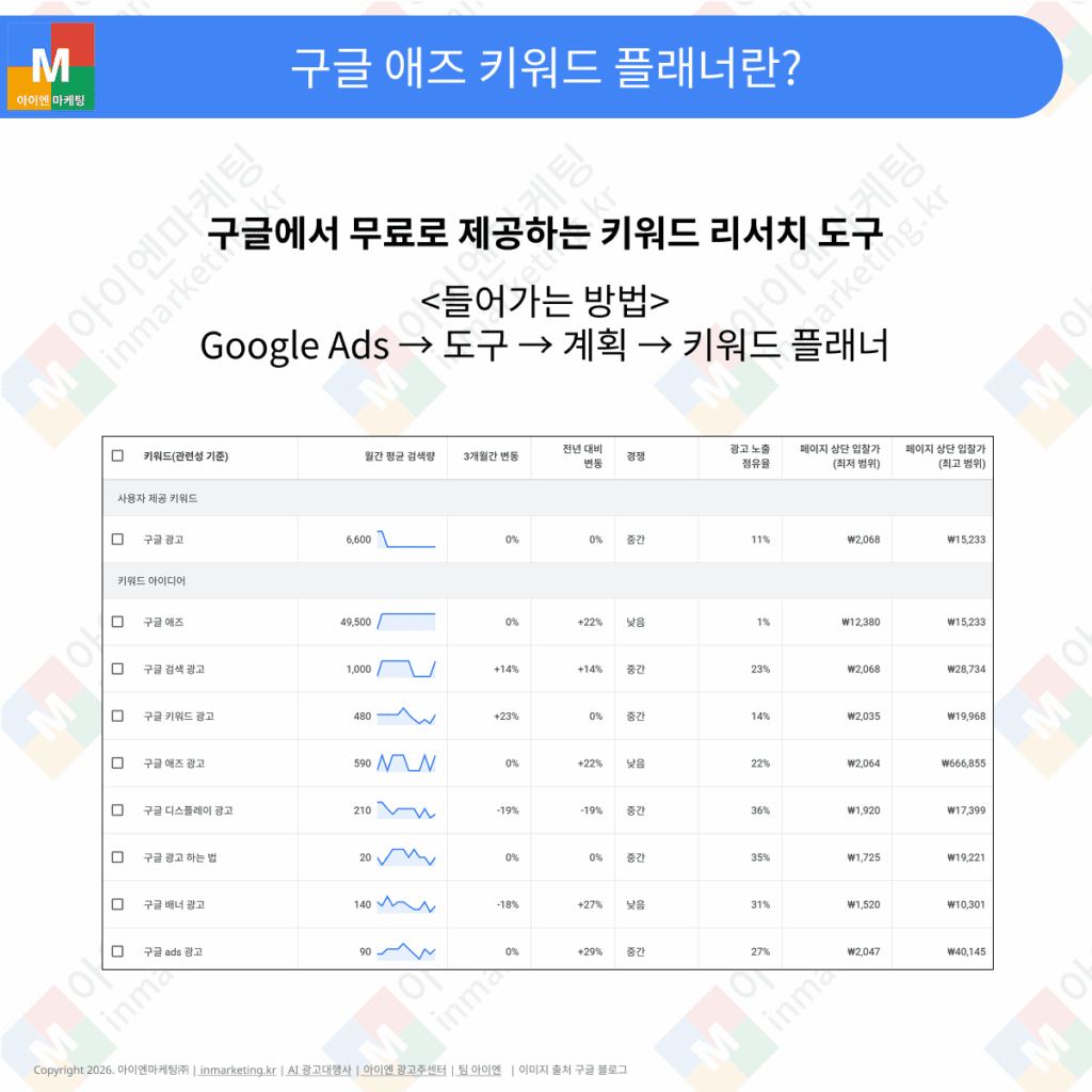 구글 키워드 플래너로 기본적인 키워드 리서치를 진행하되, 아이엔 광고주센터 키워드 분석을 함께 활용하면 구글과 네이버를 아우르는 종합적인 키워드 전략을 수립할 수 있습니다.