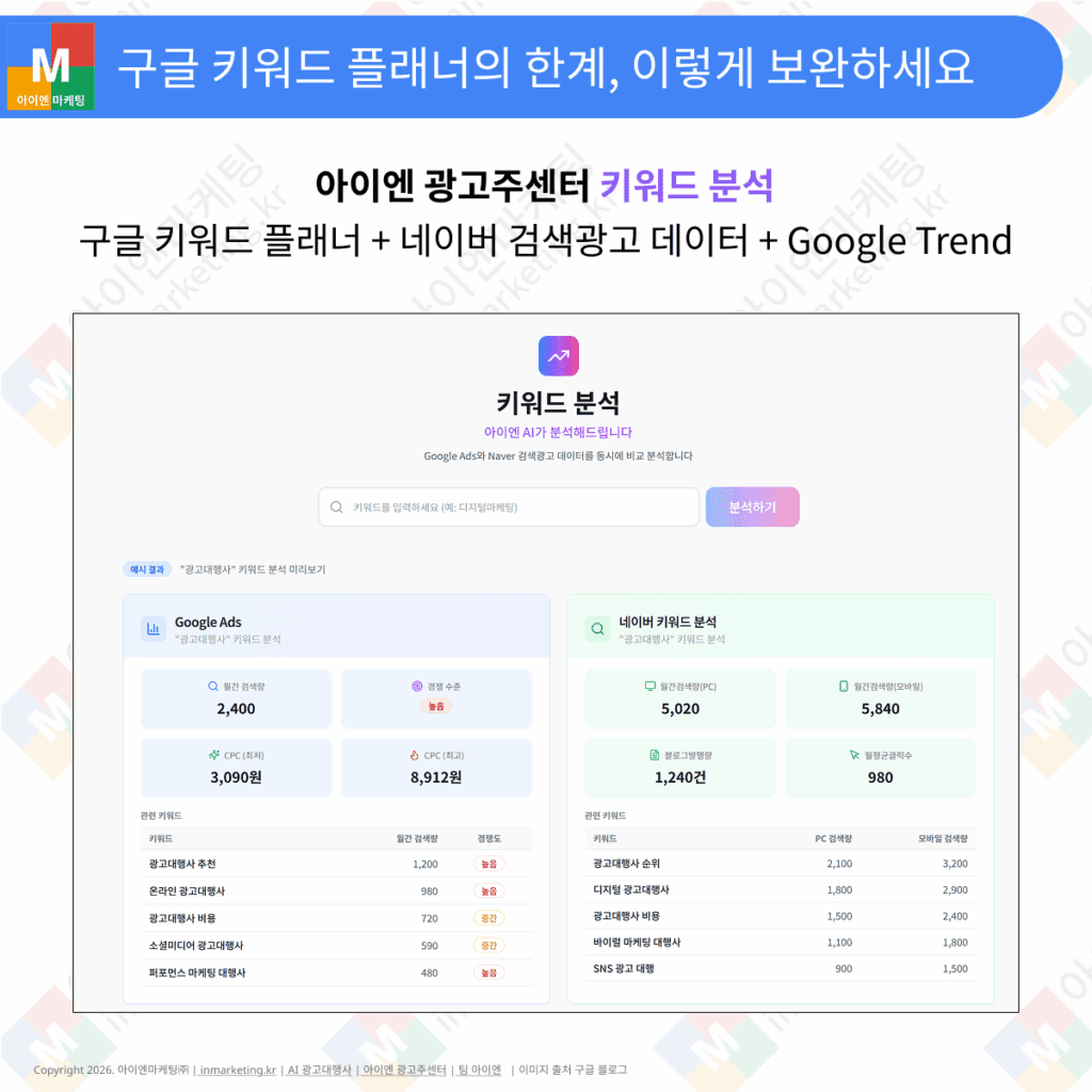 아이엔 광고주센터 키워드 분석 — 구글+네이버 통합 분석을 한 번에