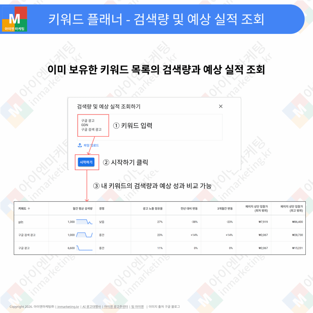 두 번째 기능은 이미 보유한 키워드 목록의 검색량과 예상 실적을 조회하는 것입니다.