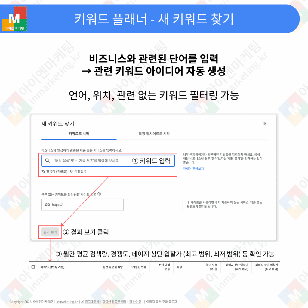 키워드 플래너의 첫 번째 핵심 기능은 새 키워드 찾기입니다. 비즈니스와 관련된 단어를 입력하면 관련 키워드 아이디어를 자동으로 생성해줍니다.