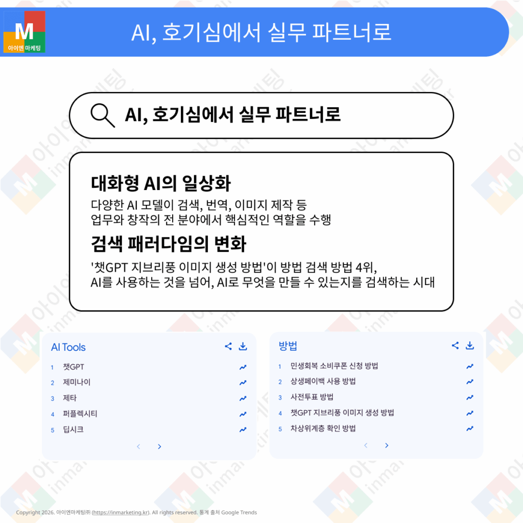 - 검색 패러다임의 변화: ‘챗GPT 지브리풍 이미지 생성 방법’이 방법 검색 4위에 올랐습니다. 단순히 AI를 사용하는 것을 넘어, AI로 무엇을 만들 수 있는지를 검색하는 시대가 됐습니다.