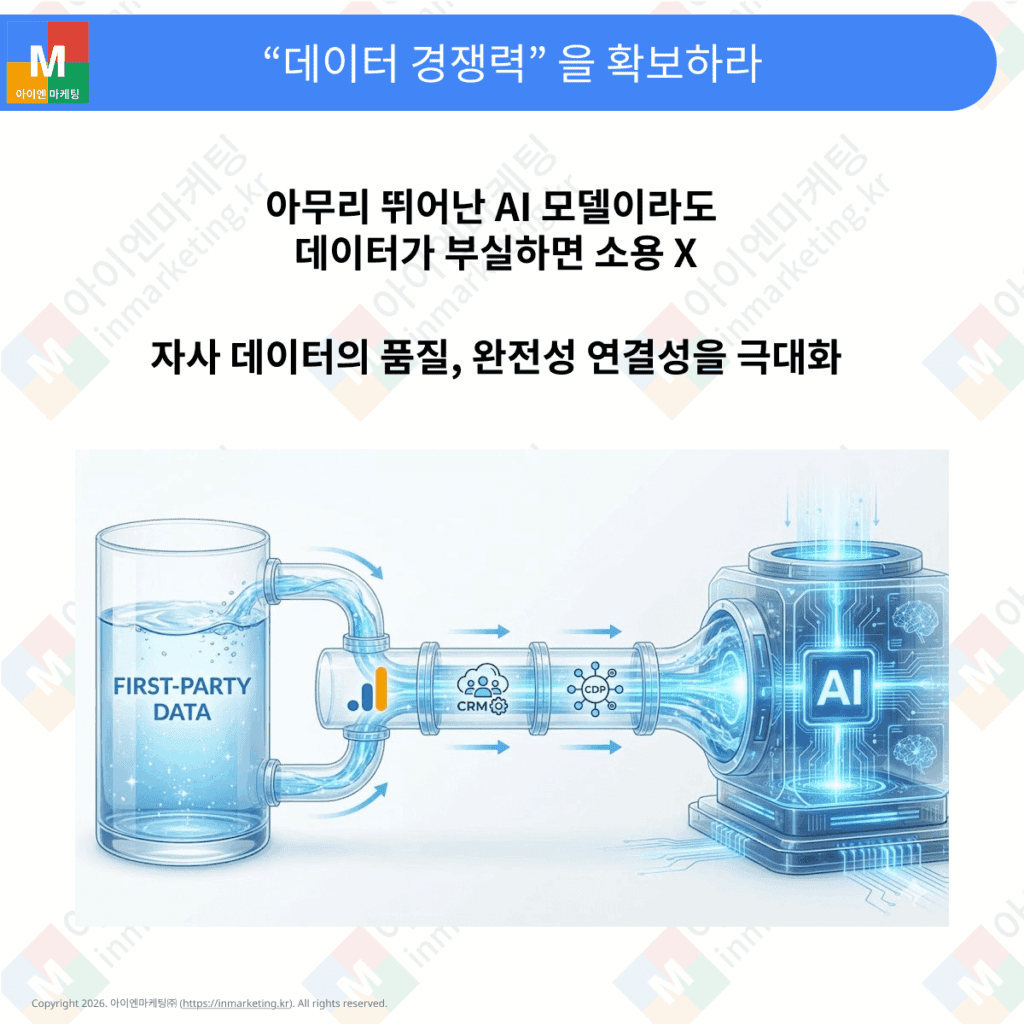 아무리 뛰어난 AI 모델이라도 입력되는 데이터가 부실하면 소용이 없습니다. 데이터 경쟁력이란 자사 데이터(First-party data)의 품질, 완전성, 연결성을 극대화하는 것을 의미합니다. 특히 한국 시장처럼 네이버, 카카오, 자사몰 등 데이터가 파편화된 환경일수록, 자사몰에서 수집되는 데이터의 품질을 점검하고 이를 AI에 제대로 된 연료로 공급하는 것이 무엇보다 중요합니다.