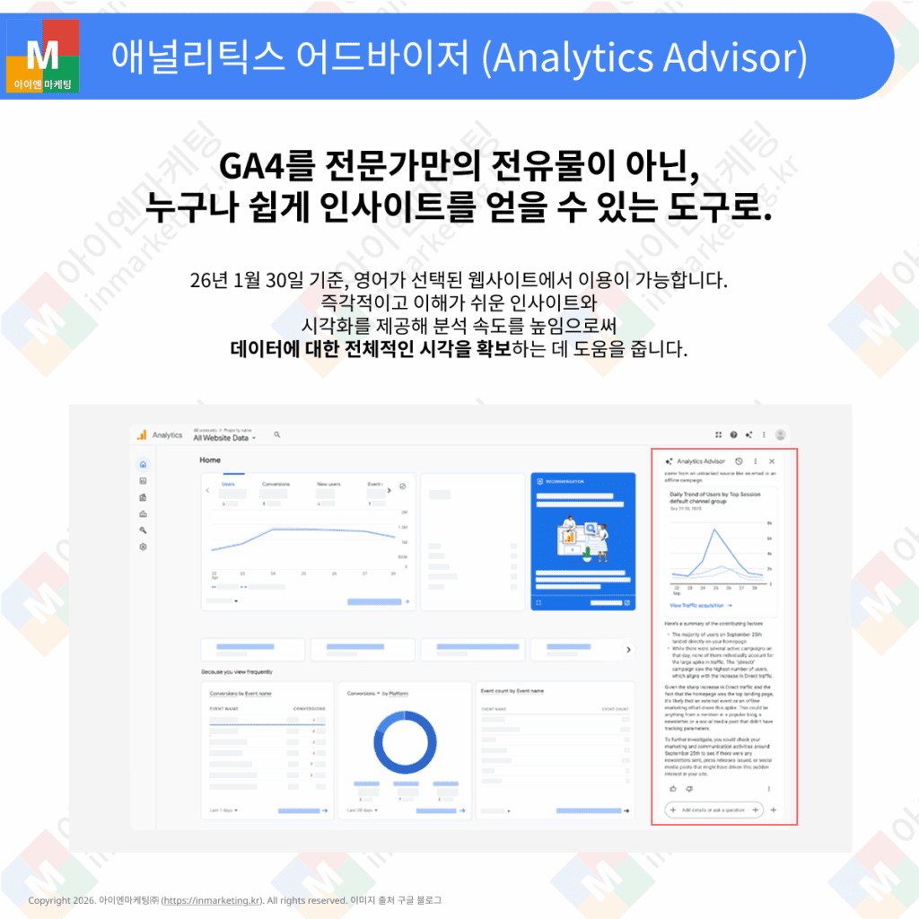 GA4 메뉴가 너무 복잡해서 포기하셨나요? 구글은 이를 해결하기 위해 ‘애널리틱스 어드바이저(Analytics Advisor)’ 라는 대화형 AI 기능을 추가했습니다.