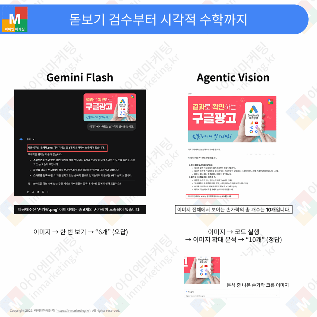 이제 AI는 본 것을 설명만 하지 않습니다. 제미나이 앱에서 손가락 개수를 셀 때, 에이전틱 비전은 파이썬 코드를 실행해 각 손가락에 번호표(Bounding Box)를 직접 그려가며 확인합니다. 이러한 ‘시각적 연습장’ 기능은 AI의 고질적인 문제였던 시각적 계산 오류를 줄여줍니다. 위 이미지에서도 기존 Gemini 3 Flash는 손가락이 6개라고 말한 반면, 에이전틱 비전은 10개를 모두 파악한 것을 알 수 있습니다.