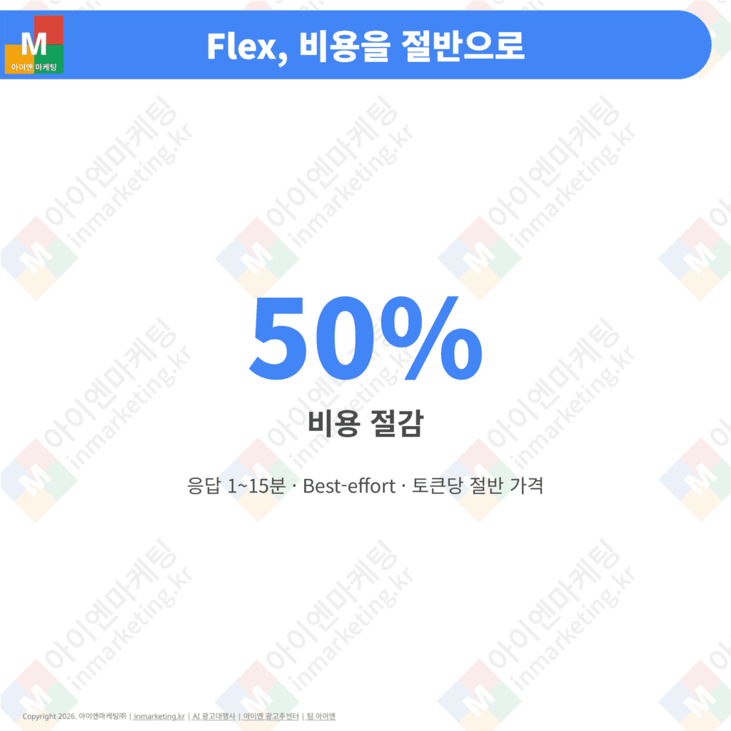 Flex는 응답 속도를 양보하는 대신 비용을 50% 절감하는 티어입니다. 토큰당 과금 기준으로 Standard의 절반입니다.