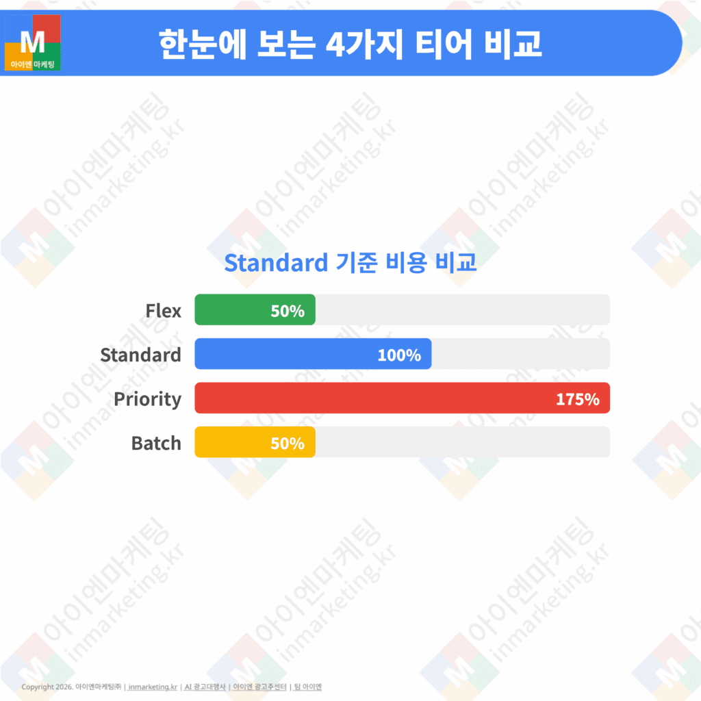 기존에는 Standard 티어(기본 요금)와 Batch(비동기 대량 처리) 두 가지만 있었습니다. 이제 Flex와 Priority가 추가되면서, 워크로드 특성에 따라 비용과 응답 속도를 더 세밀하게 조절할 수 있게 되었습니다.