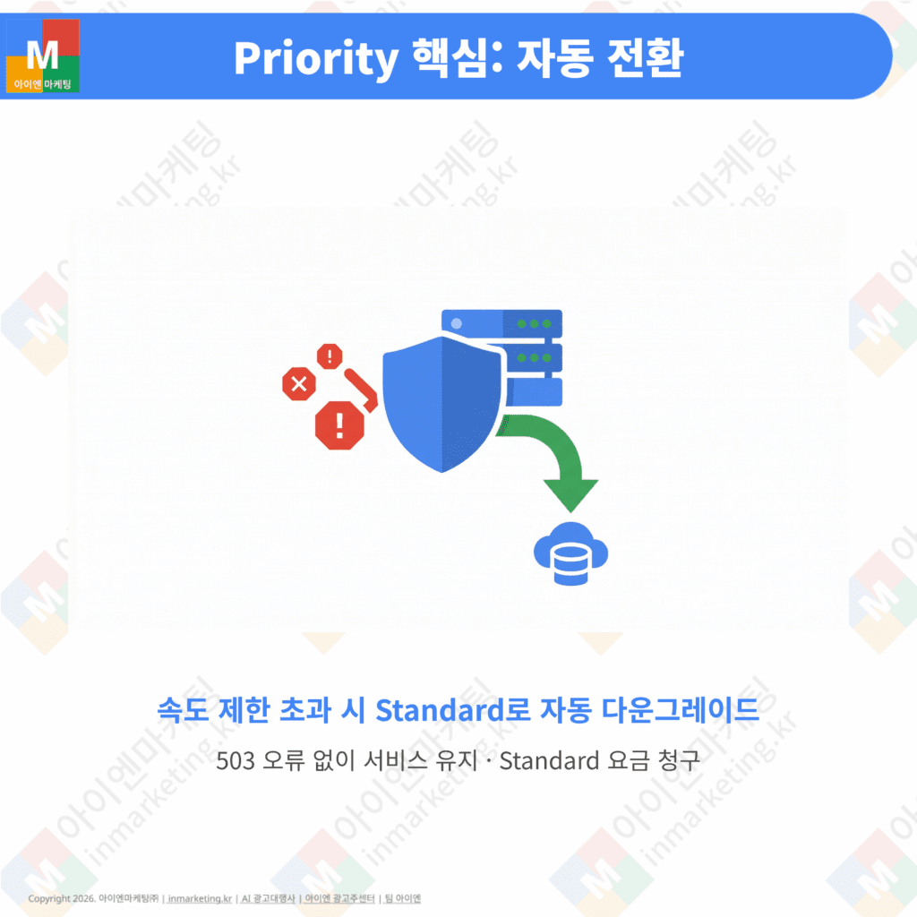 Priority의 가장 큰 장점은 요청이 실패하지 않는다는 것입니다. 속도 제한을 초과하면 503 오류 대신 자동으로 Standard 티어로 다운그레이드됩니다. 이때 요금도 Standard 기준으로 청구됩니다. 서비스 중단 없이 안정적으로 운영할 수 있는 구조입니다.