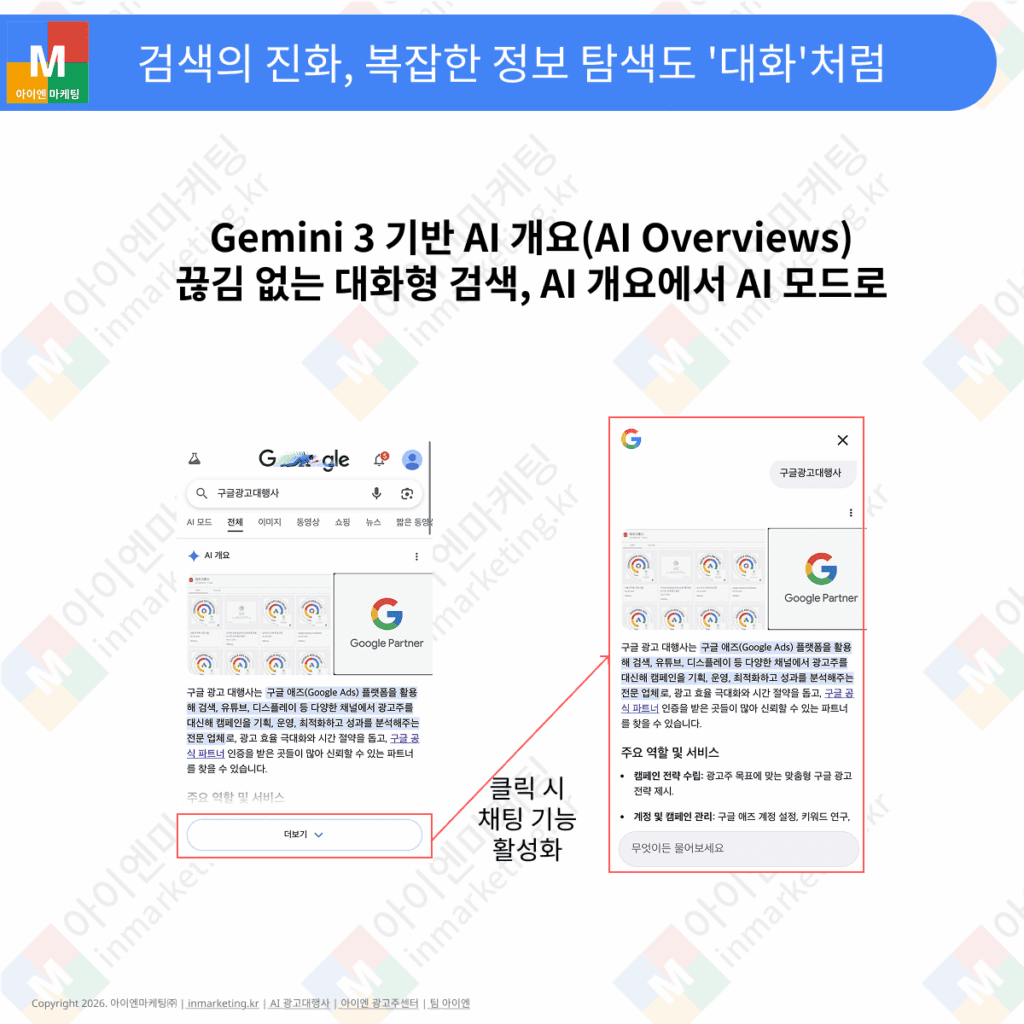 아이엔마케팅은 Google과 AI의 변화에 가장 빠르게 대응하는 구글 전문 광고 대행사입니다. 내 비즈니스에 맞는 구글 광고 전략이 필요하시다면 ‘아이엔마케팅 홈페이지‘, 혹은 AI 아이엔마케팅 사이트에 방문해주세요. 자세한 상담 및 제안서를 받아보시고 싶으신가요? 지금 아이엔마케팅 홈페이지에서 무료 제안서를 신청하시고, 내 비즈니스에 최적화된 맞춤 제안서를 받아보세요.