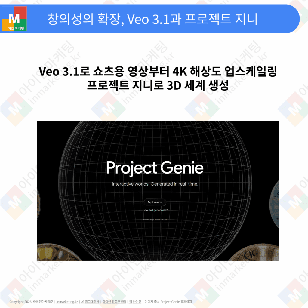 💡 참고 게시물 Veo 3.1 업데이트, 구글 AI 로 광고 영상 직접 만드는 시대 열렸다 / 프로젝트 지니(Project Genie), 나만의 가상 세계를 만들고 탐험하기