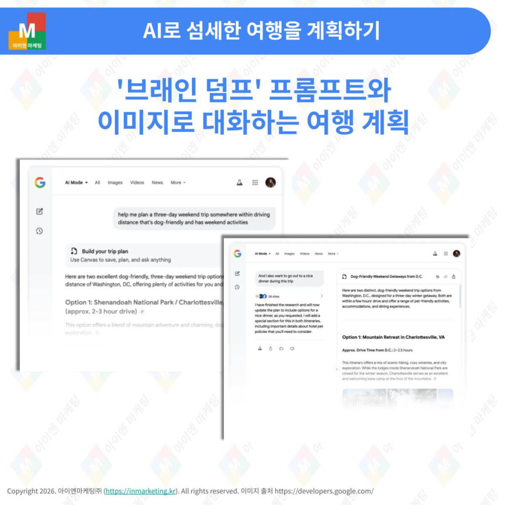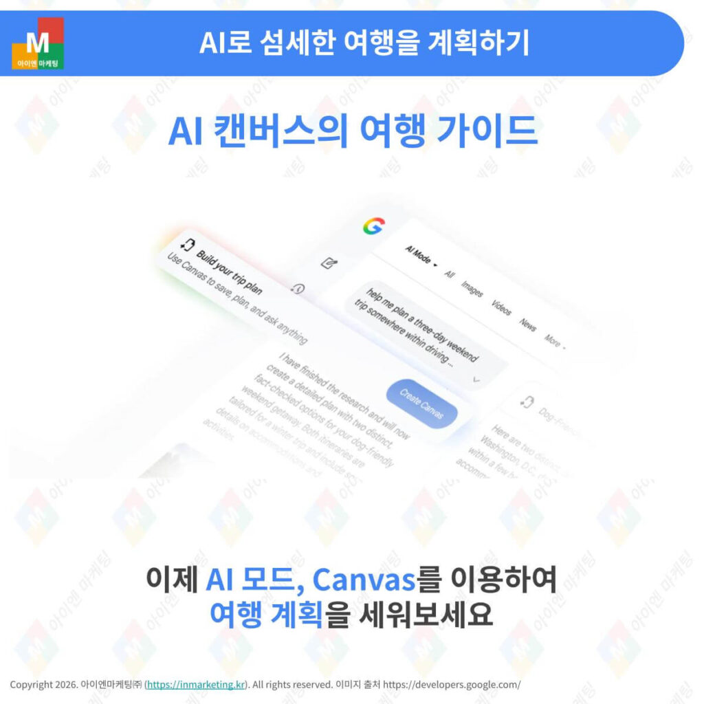 기존의 여행 계획이 수십 개의 브라우저 탭을 열어두고 항공권, 호텔, 맛집을 일일이 비교하는 ‘노동’이었다면, 구글의 캔버스는 대화 한 번으로 이 모든 정보를 하나의 패널에 일목요연하게 정리해 주는 도구입니다. 구글은 검색이 단순히 정보를 찾는 단계를 넘어, 사용자의 복잡한 요구사항을 이해하고 실질적인 결과물(일정표)을 만들어내는 ‘에이전트’ 시대로 진입했음을 보여주고 있습니다.