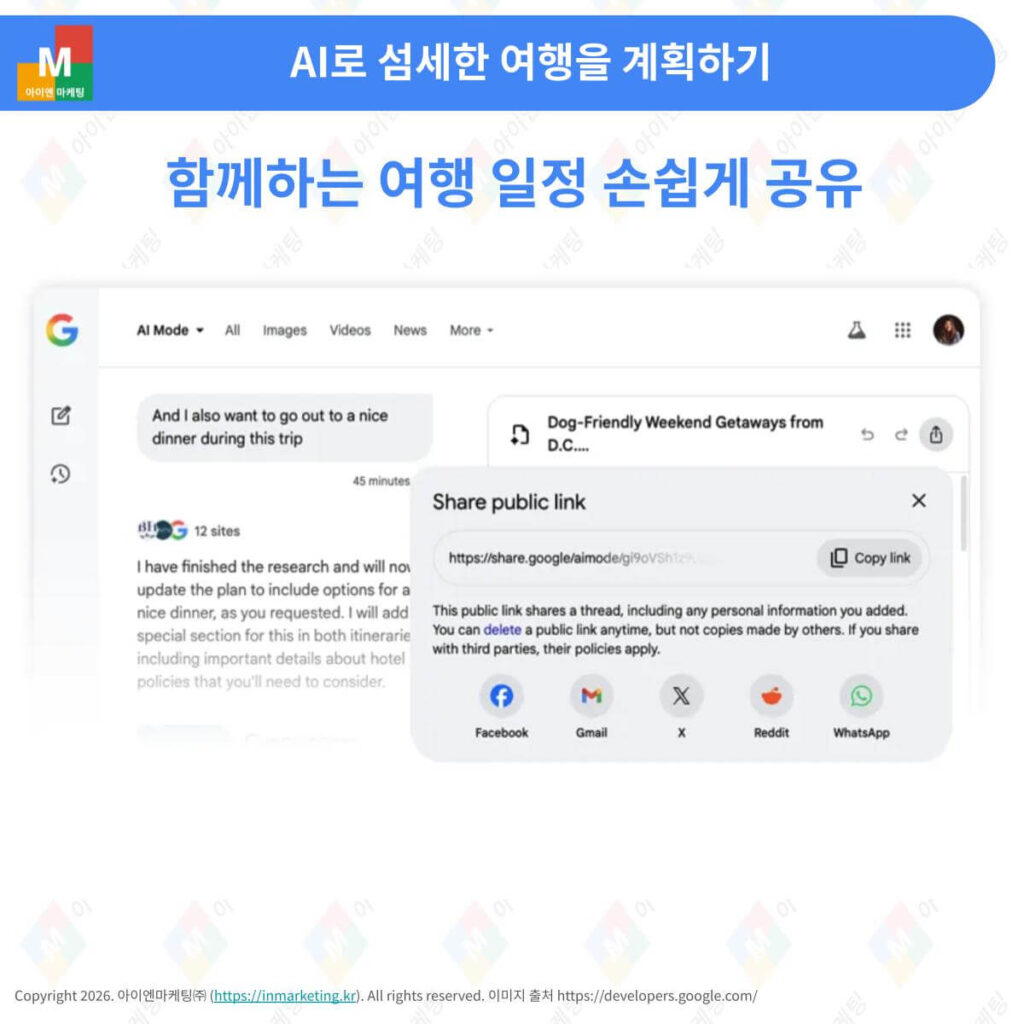 - 중단해도 괜찮은 연속성: 여행 계획은 한 번에 끝나지 않습니다. 구글 AI 모드는 작업하던 캔버스를 자동으로 저장하므로, 며칠 뒤에 돌아와서도 “어제 짠 일정에서 식당만 좀 더 조용한 곳으로 바꿔줘”라고 바로 이어서 지시할 수 있습니다.