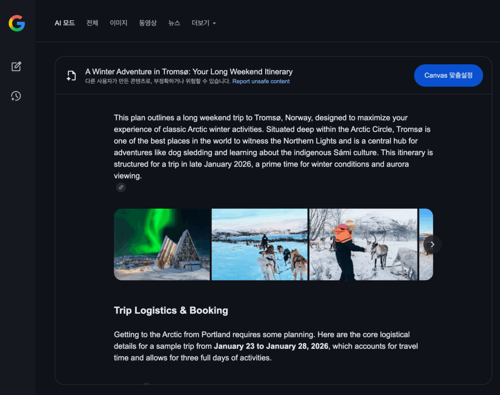 Google 팀에서 만든AI Mode Canvas 겨울 스칸디나비아 여행 일정을 확인해 보세요.