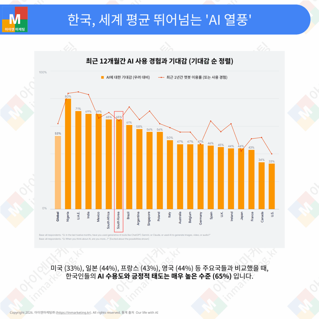 - 한국 응답자의 65%가 AI가 가져올 미래에 대해 기대하고 있다고 답했습니다. 이는 글로벌 평균인 53%를 크게 웃도는 수치입니다.