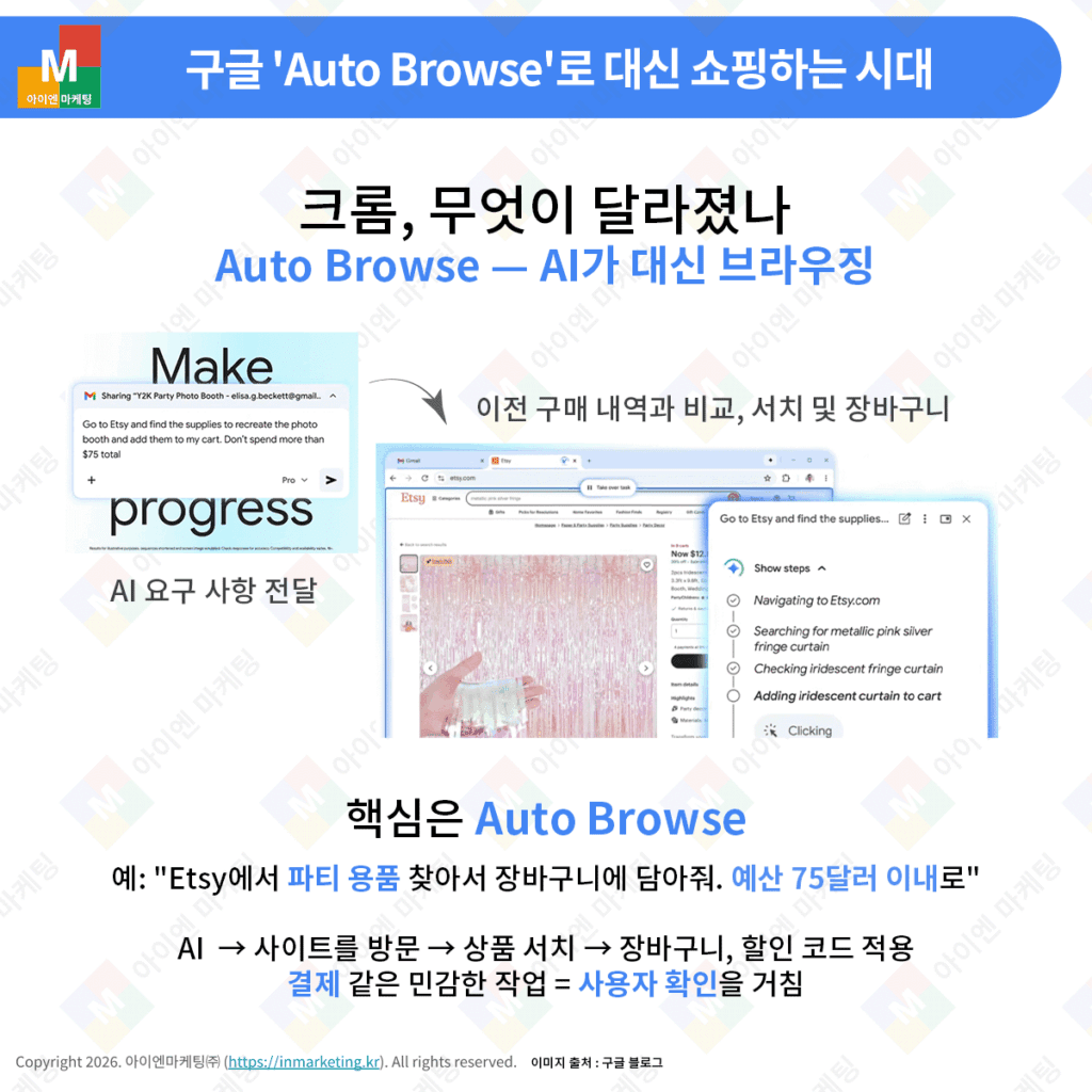 핵심은 Auto Browse입니다. “Etsy에서 파티 용품 찾아서 장바구니에 담아줘. 예산 75달러 이내로”라고 말하면, AI가 직접 사이트를 방문해 상품을 찾고 장바구니에 담습니다. 할인 코드 적용까지 자동입니다.