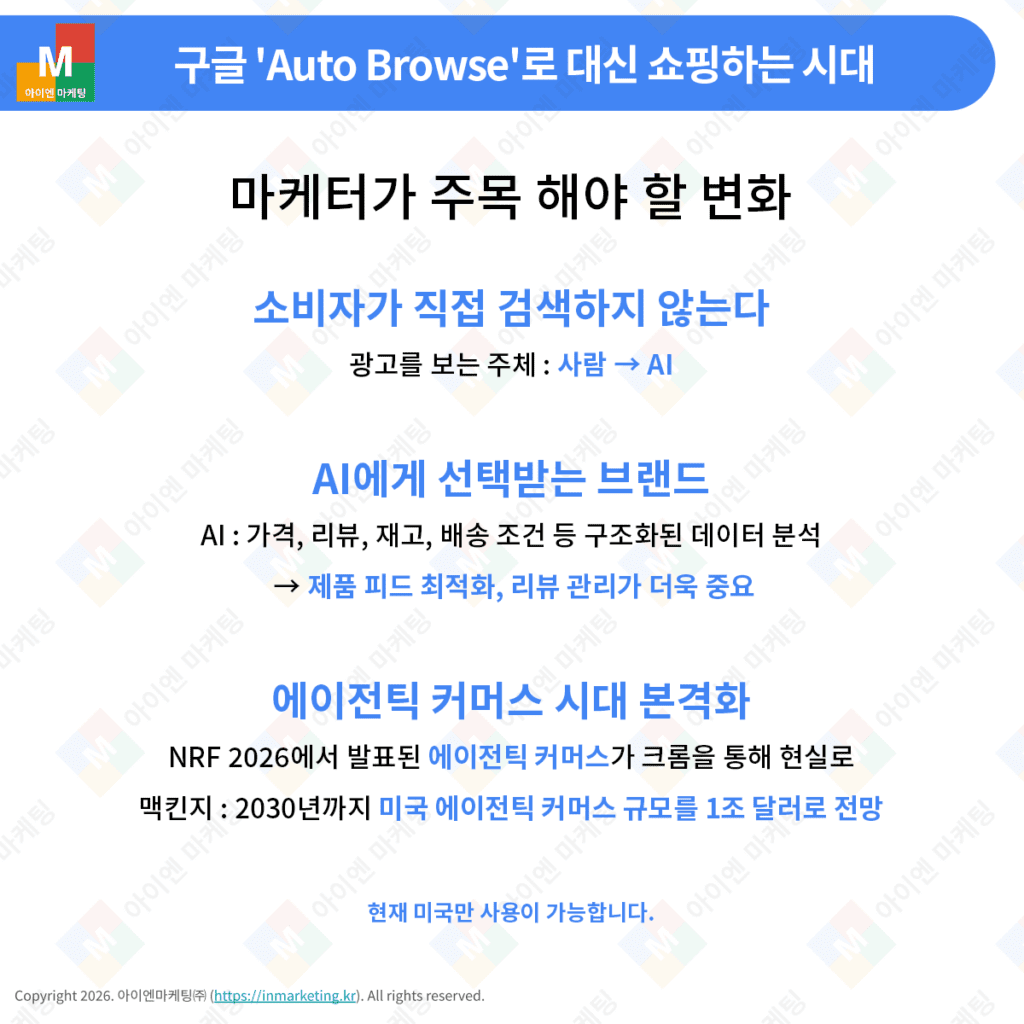 NRF 2026에서 발표된 에이전틱 커머스가 크롬을 통해 현실이 됩니다. 맥킨지는 2030년까지 미국 에이전틱 커머스 규모를 1조 달러로 전망하고 있습니다.