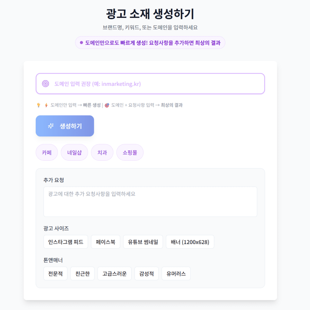 아이엔 광고주센터에서는 광고 이미지 소재 자동 생성을 제공하고 있습니다. 지금 아이엔 광고주센터에 방문해서 이미지를 생성해 보세요.