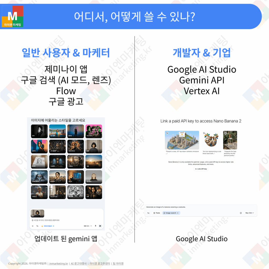- 제미나이 앱: 기본 모델로 적용. Pro/Ultra 구독자는 점 3개 메뉴에서 나노 바나나 Pro 선택 가능