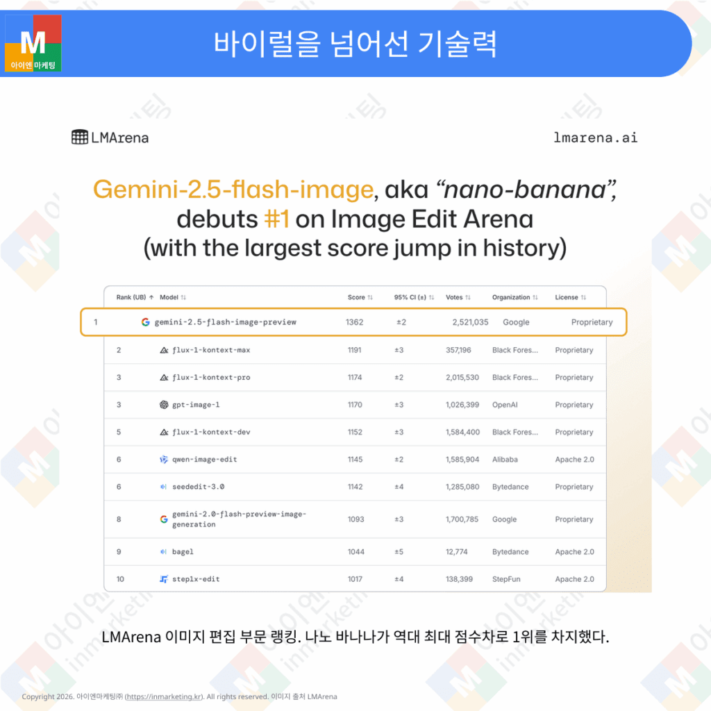 이름만 재미있었다면 그냥 넘어갔을 겁니다. 하지만 나노 바나나는 2024년 8월 초 LMArena에 공개되자마자 전 세계 1위 이미지 편집 모델로 등극했습니다. 사용자들은 인물의 특징을 그대로 유지하면서 여러 이미지를 정교하게 합성하는 능력에 놀라움을 금치 못했습니다.