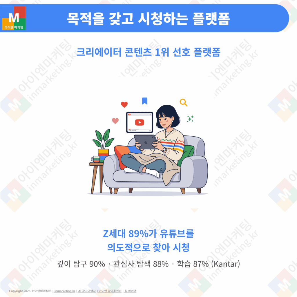 소셜 플랫폼이 수동적 스크롤에 머무는 반면, 유튜브는 높은 주의력과 높은 의도가 결합된 시청 환경을 만듭니다.