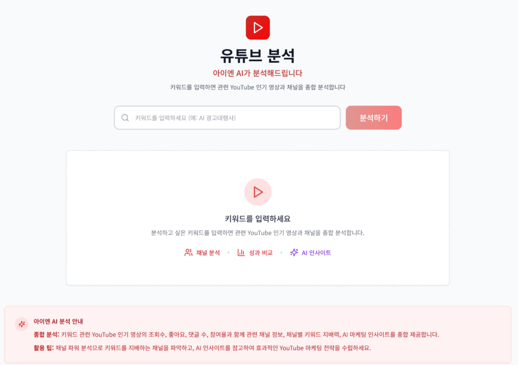 아이엔 광고주센터는 이 Boost 단계를 돕습니다. 유튜브 분석 기능으로 특정 키워드·채널에서 어떤 영상이 반응을 얻고 있는지 파악하고, 아이엔 AI가 브랜드 사이트를 분석해 유튜브 인스트림·인피드·Demand Gen(이미지/캐러셀/동영상) 광고 카피를 자동 생성합니다. 여기에 KOSIS·네이버데이터랩·Google Trends 기반 시장 트렌드 분석까지 한 화면에서 확인할 수 있어, “어떤 메시지로 Boost할지”를 데이터 기반으로 결정할 수 있습니다.